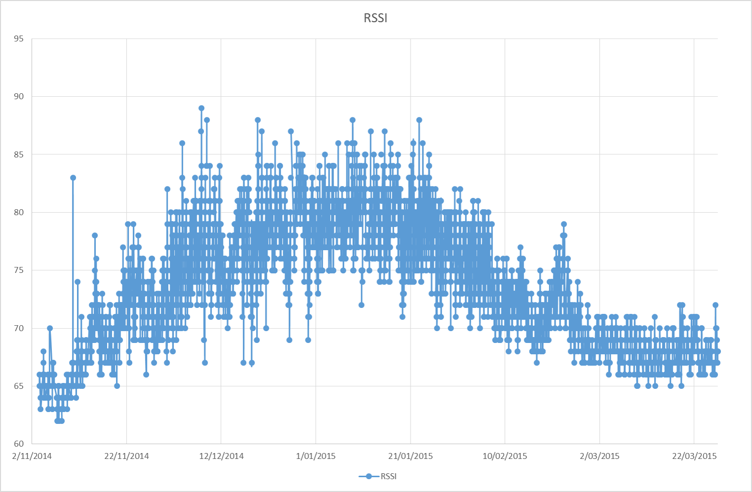 Designed as system diagnostic tool, the radio RSSI (Received Signal Strength Indication) between two Hubs, and between a Hub and an instrument, has shown seasonal fluctuation as environmental moisture levels have changed.